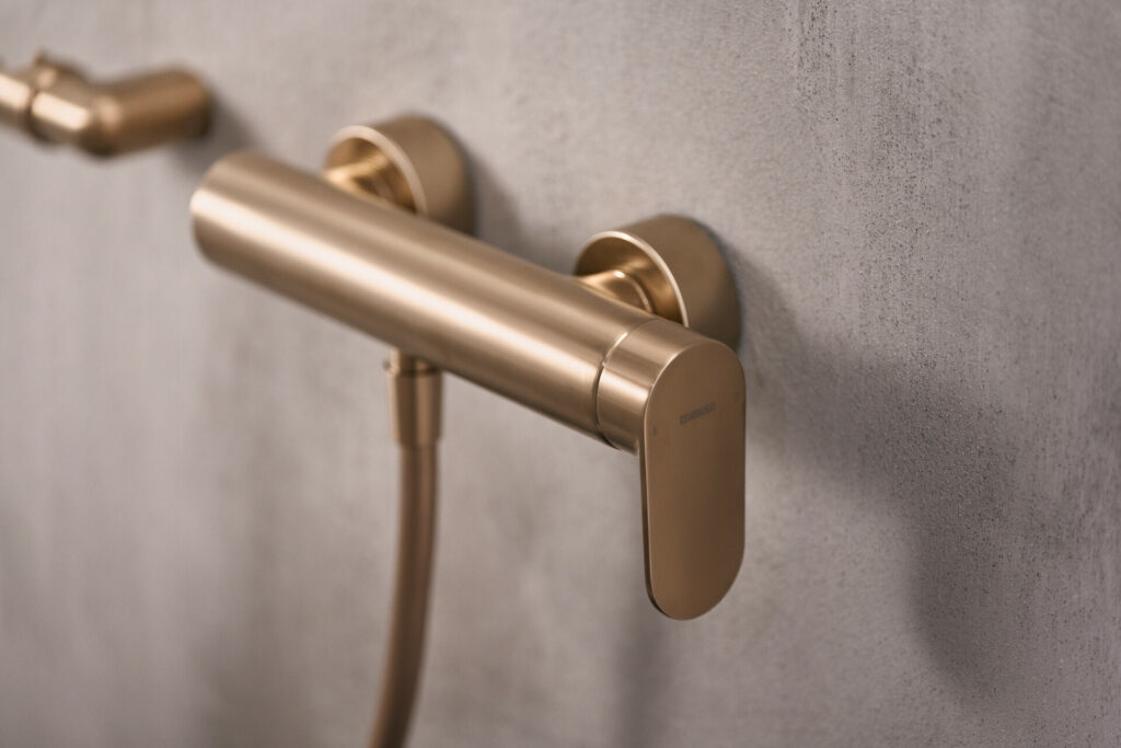 Bei den wandmontierten Bad- und Duscharmaturen sitzt der Hebel seitlich – markant in der Form und bequem in das Gesamtdesign integriert.